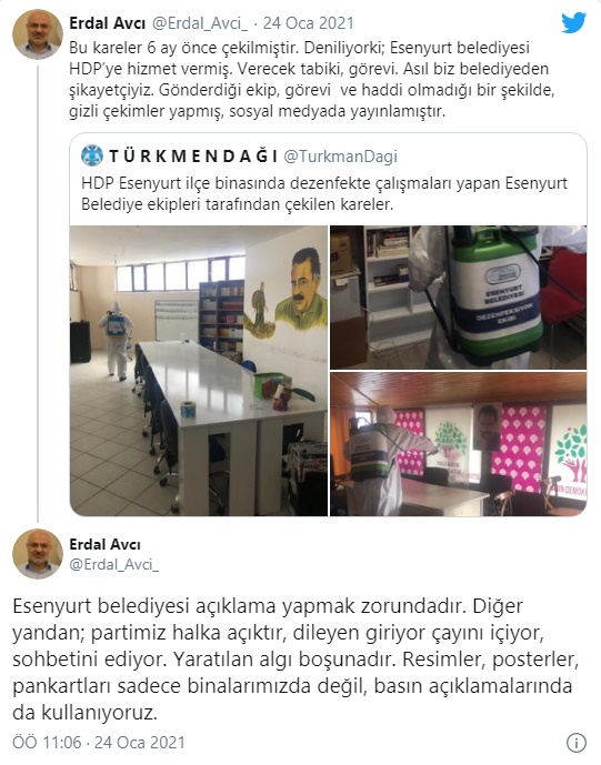 HDP İstanbul İl Başkanı Erdal Avcı, HDP Esenyurt ilçe binasından teröristbaşı posteri ve PKK paçavraları çıkmasının ardından CHP’li Esenyurt Belediyesi'nden resmi açıklama istedi. Fotoğrafların 6 ay önce çekildiğini söyleyen Avcı, "Belediye’nin gönderdiği ekip, görevi ve haddi olmadığı bir şekilde gizli çekim yapmış, sosyal medyada yayınlamıştır. Esenyurt belediyesi açıklama yapmak zorundadır" dedi.