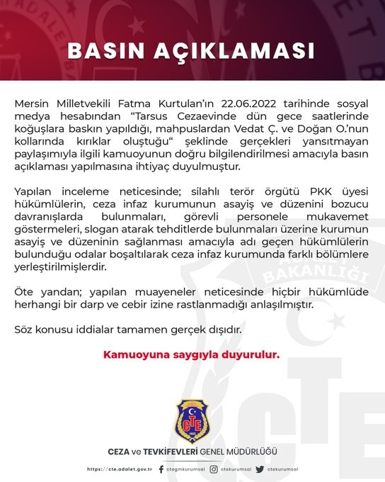 Ceza ve Tevkif Evleri Genel Müdürlüğü, HDP’li Kurtulan’ın, “Tarsus Cezaevinde işkence” iddialarını yalanlayarak, “Yapılan muayeneler neticesinde hiçbir hükümlüde herhangi bir darp ve cebir izine rastlanmadığı anlaşılmıştır.” açıklamasında bulundu. Açıklamada şu ifadelere yer verildi; “Mersin Milletvekili Fatma Kurtulan’ın 22.06.2022 tarihinde sosyal medya hesabından “Tarsus Cezaevinde dün gece saatlerinde koğuşlara baskın yapıldığı, mahpuslardan Vedat Ç. ve Doğan O.’nun kollarında kırıklar oluştuğu“ şeklinde gerçekleri yansıtmayan paylaşımıyla ilgili kamuoyunun doğru bilgilendirilmesi amacıyla basın açıklaması yapılmasına ihtiyaç duyulmuştur.