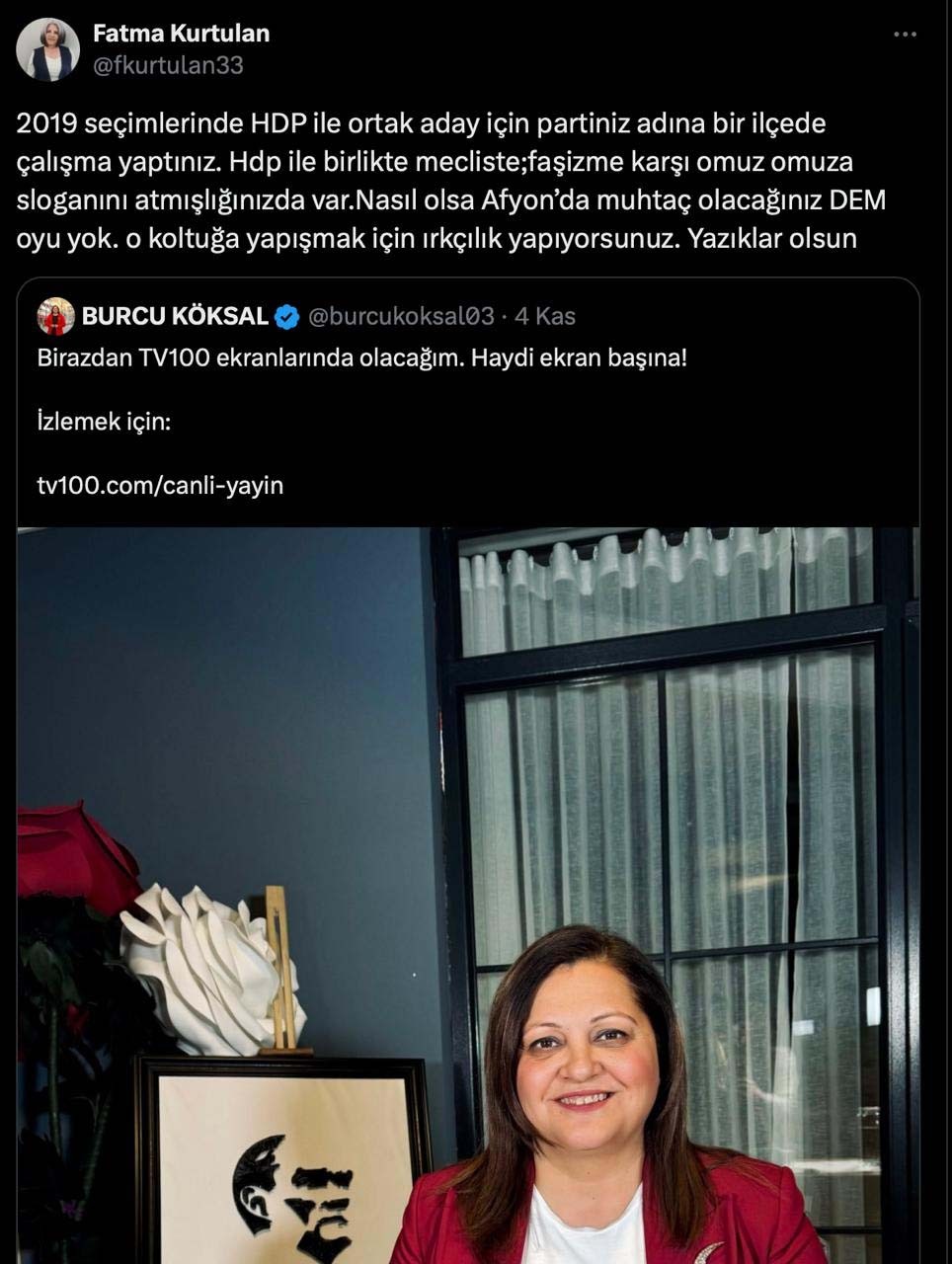 HDP eski Milletvekili Fatma Kurtulan, geçtiğimiz günlerde CHP Genel Başkanı Özgür Özel’in çağrısına kulak asmayarak Esenyurt’a gitmeyen Afyonkarahisar Belediye Burcu Köksal’a sosyal medyada yüklendi. CHP’li Burcu Köksal’ın milliyetçiliğinin sözde olduğunun ima edildiği paylaşımda Kurtulan, “2019 seçimlerinde HDP ile ortak aday için partiniz adına bir ilçede çalışma yaptınız” dedi.