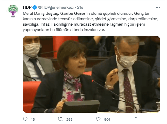 TBMM'de konuşan HDP Grup Başkanvekili Meral Danış Beştaş, Gezer'in işkence gördüğünü iddia ederek, iktidarı hedef aldı. Beştaş, "Garibe Gezer’in ölümü şüpheli ölümdür. Genç bir kadının cezaevinde tecavüz edilmesine, şiddet görmesine, darp edilmesine, savcılığa, İnfaz Hakimliği’ne müracaat etmesine rağmen hiçbir işlem yapmayanların bu ölümün altında imzaları var." dedi.