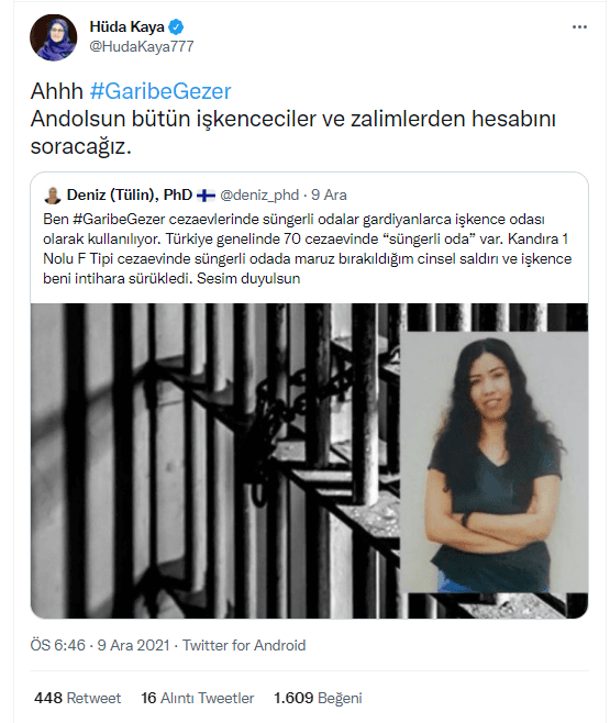 Twitter hesabından paylaşımda bulunan HDP İstanbul Milletvekili Hüda Kaya ise "Andolsun bütün işkenceciler ve zalimlerden hesabını soracağız." ifadelerini kullandı.