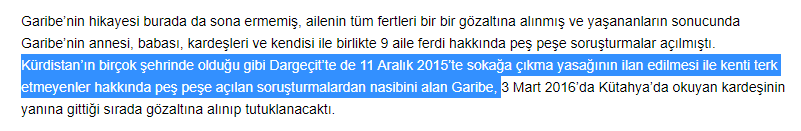 "Kürdistan’ın birçok şehrinde olduğu gibi Dargeçit’te de 11 Aralık 2015’te sokağa çıkma yasağının ilan edilmesi ile kenti terk etmeyenler hakkında peş peşe açılan soruşturmalardan nasibini alan Garibe, 3 Mart 2016’da Kütahya’da okuyan kardeşinin yanına gittiği sırada gözaltına alınıp tutuklanacaktı."