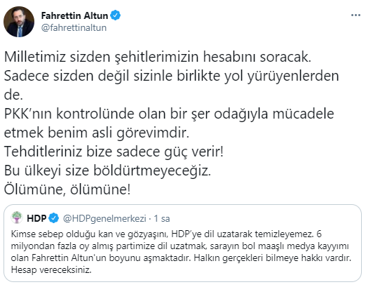 Fahrettin Altun HDP'nin paylaşımını retweet yaparak, "Milletimiz sizden şehitlerimizin hesabını soracak. Sadece sizden değil sizinle birlikte yol yürüyenlerden de. PKK’nın kontrolünde olan bir şer odağıyla mücadele etmek benim asli görevimdir. Tehditleriniz bize sadece güç verir! Bu ülkeyi size böldürtmeyeceğiz. Ölümüne, ölümüne!" ifadelerini kullandı.