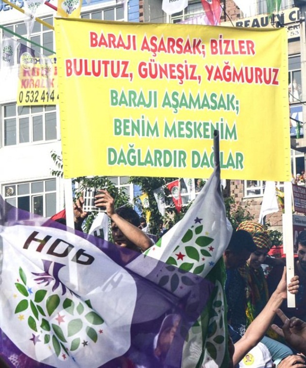 HDP'nin Batman mitinginde "Barajı aşarsak, bizler bulutuz, güneşiz, yağmuruz, barajı aşamasak, benim meskenim dağlardır dağlar" yazılı pankart açılması, Doğu Anadolu bölgesinde tepkiyle karşılandı.