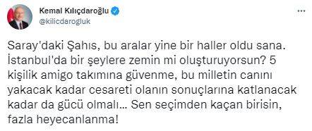 Saray'daki Şahıs, bu aralar yine bir haller oldu sana. İstanbul'da bir şeylere zemin mi oluşturuyorsun? 5 kişilik amigo takımına güvenme, bu milletin canını yakacak kadar cesareti olanın sonuçlarına katlanacak kadar da gücü olmalı… Sen seçimden kaçan birisin, fazla heyecanlanma!