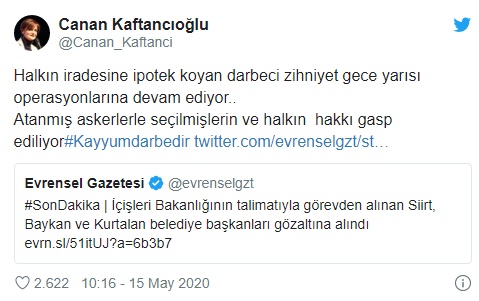 Kaftancıoğlu, "Halkın iradesine ipotek koyan darbeci zihniyet gece yarısı operasyonlarına devam ediyor.. Atanmış askerlerle seçilmişlerin ve halkın hakkı gasp ediliyor #Kayyumdarbedir" ifadelerini kullandı.