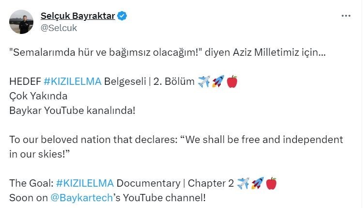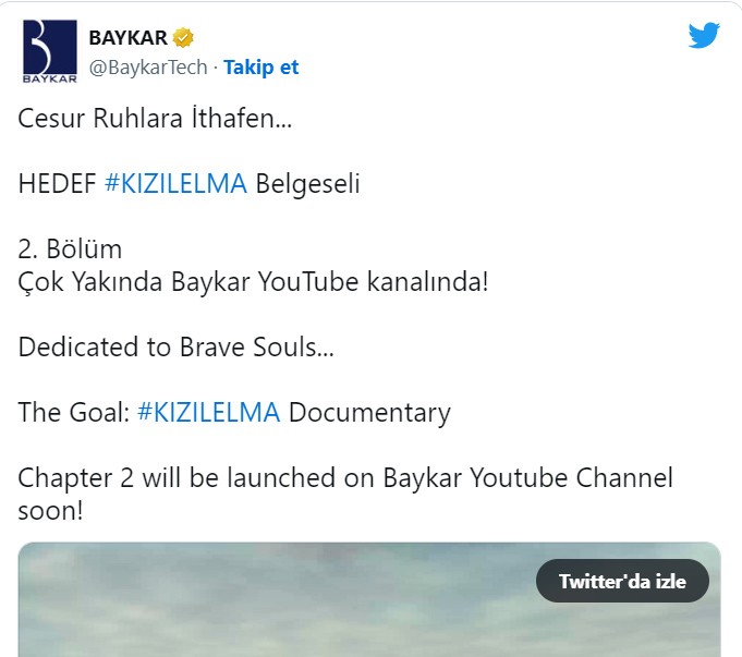 HEDEF KIZILELMA Belgeseli 2. Bölüm çok yakında Baykar YouTube kanalında" ifadelerini kullandı. Baykar'ın resmi sosyal medya hesabından paylaşılan videoya "Cesur Ruhlara İthafen..." notu düşüldü.