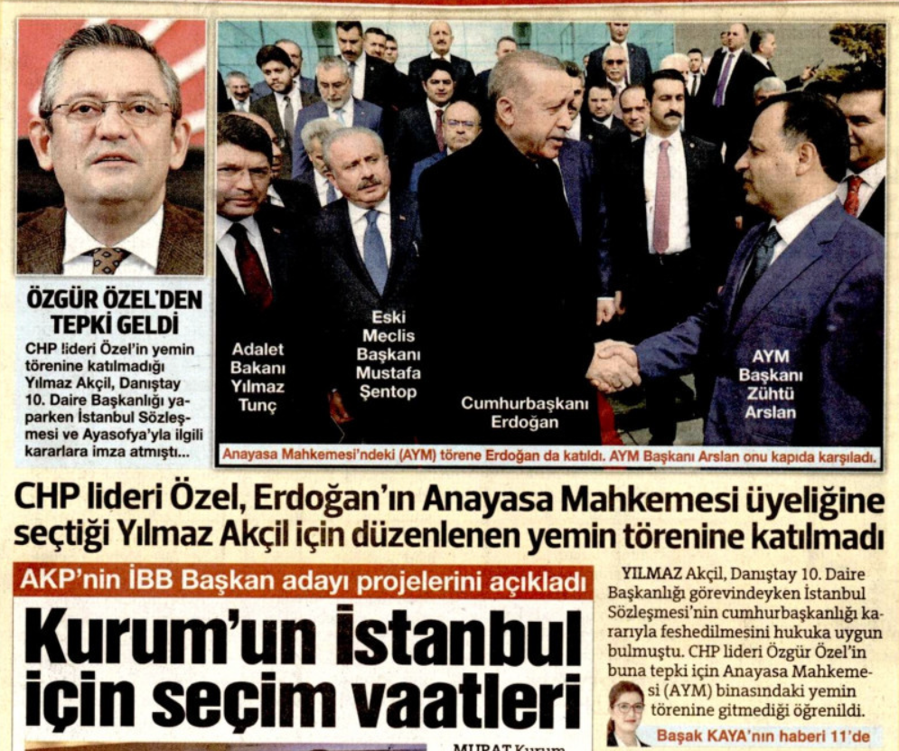 CHP Genel Başkanı Özgür Özel, AYM’nin yeni üyesi Yılmaz Akçil’e tepki için yemin törenine katılmadı. Sözcü de Özel’in bu kararını parlatmaya kalktı. Akçil, Danıştay 10. Daire Başkanı iken Ayasofya’nın yeniden cami olarak ibadete açılması yönünde karar vermişti. Ayasofya’nın açılmasını, “2020’nin felaketleri” arasında kabul eden Sözcü’nün Akçil’i hedef alması şaşırtmadı!..