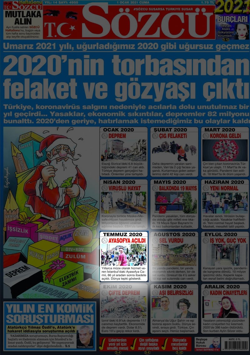 Memleket muhaliflerinin ‘Sözcü’sü 2020 yılı son bulurken yayınladığı bir haberle büyük infiale neden olmuştu. Yıl içinde yaşanan felaketleri manşete taşıyan Sözcü, Ayasofya’nın ibadete açılmasını da saymıştı. Haberde, Ayasofya’nın ibadete açıldıktan sonra dünyanın ayağa kalktığı ileri sürülmüştü.
