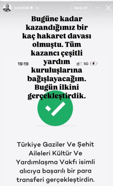 TÜGŞAV'dan yapılan açıklamada, "Ezhel ismiyle bilinen bir sanatçı kazandığı bir hakaret davasından aldığı tazminatı vakfımıza bağışlamıştır. Bölücü terör örgütüne destek açıklamalarıyla gündeme gelen ve Türkiye Cumhuriyeti devletine girişi yasak olan hiç kimseden bağış ve yardım kabul etmiyoruz. Vakfımız hesabına aktarılan bağış miktarı kişinin hesabına iade edilmiştir. Ola ki bir gün hakkındaki iddialardan aklanır ve Türkiye Cumhuriyeti devletine giriş yapabilirse, bağışını bizzat yapması için kendisini vakfımıza bekleriz" ifadelerine yer verildi. Ayrıca paylaşımda Ezhel'in daha önce terör örgütüne yakınlığı ile gündeme gelen paylaşımlarına yer verildi.