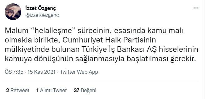 Özgenç, Twitter hesabından yaptığı paylaşımda “Malum ‘helalleşme’ sürecinin, esasında kamu malı olmakla birlikte, Cumhuriyet Halk Partisinin mülkiyetinde bulunan Türkiye İş Bankası AŞ hisselerinin kamuya dönüşünün sağlanmasıyla başlatılması gerekir” ifadelerine yer verdi.