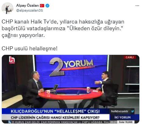 Gültekin'in açıklamalarını sosyal medya hesabından alıntılayan ve "CHP usulü helalleşme" yorumunu yapan AK Parti İzmir Milletvekili Alpay Özalan, "CHP kanalı Halk Tv'de, yıllarca haksızlığa uğrayan başörtülü vatandaşlarımıza "Ülkeden özür dileyin." çağrısı yapıyorlar." dedi.