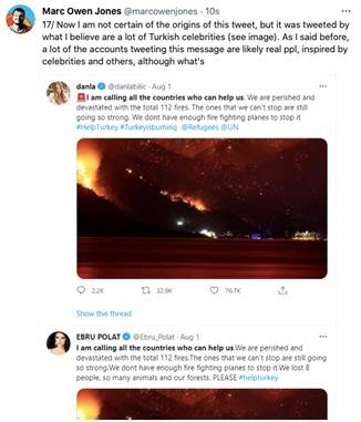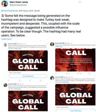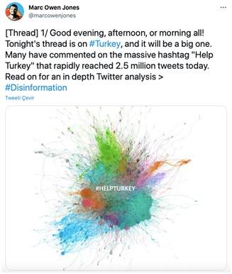 Sosyal medyaağ analizleri ile tanınan akademisyen Dr. MarcOwenJones,orman yangınlarıyla mücadele için Türkiye’ye uluslararası yardım çağrısı görünümü altında“HelpTurkey” etiketiyle başlatılan dezenformasyon amaçlı kampanyaya ilişkin önemli bir dijital analiz yayınladı.
