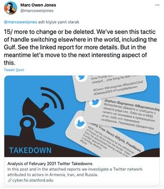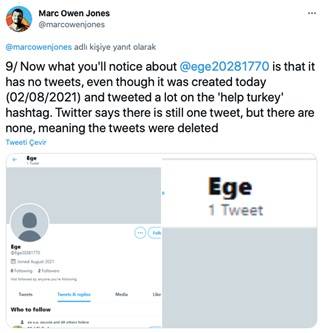 Jones, bir örnek olarak, buetiket altında en çok etkileşim gösteren ve sadece 2 takipçisi olan @ege20281770 hesabının 2 Ağustos’ta açıldığını, normalde birçok Tweet bulunması gereken hesapta şu anda hiçbir Tweet bulunmadığını, çünküalgı operasyonu için etikete yazdıktan sonra tespit edilmeyi önlemek için hesap sahibinin tweetleri sildiğinibelirtti.