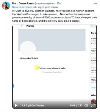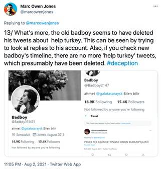 Jones, araştırmasında etiketle ilgili en aktif kullanıcılardan olan ve yoğun paylaşımlar yapan 15 bin takipçili @Badboy2147 hesabında da sıra dışı bir durum tespit etti. Algı operasyonunun ardından bu hesabın kullanıcı adı@Badboy353435 olarakdeğiştirilmişti.Dahası, “HelpTurkey” ile ilgili tweetleri de silinmişti.