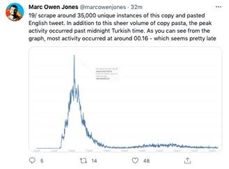 “HelpTurkey” etiketi altında paylaşımlarda bu tür algı kampanyalarında görüldüğü gibi“kopyala-yapıştır” taktiğinin de kullanıldığını belirten Jones, binlerce hesabın İngilizce hazırlanmış bir Tweet’i etiket altında herhangi bir değişiklik ya da retweet yapmadan kopya bir şekilde paylaştığına işaret etti.