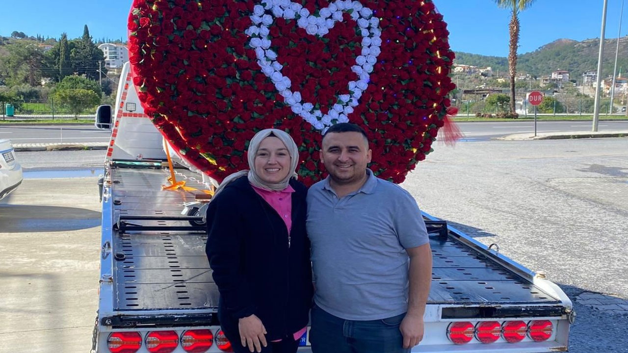Antalya’nın Gazipaşa ilçesinde çekicilik yapan Hüseyin Yılmaz, aracın vincini 777 gülle donatarak eşine sürpriz yaptı. Yılmaz’ın sürprizi sosyal medyada yayılınca, hem ilçesinde hem de Türkiye’de tanımayan kalmadı.