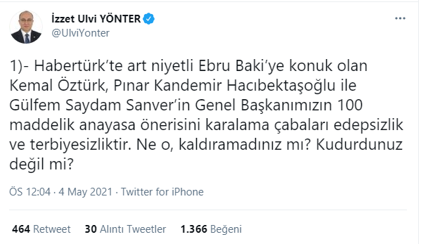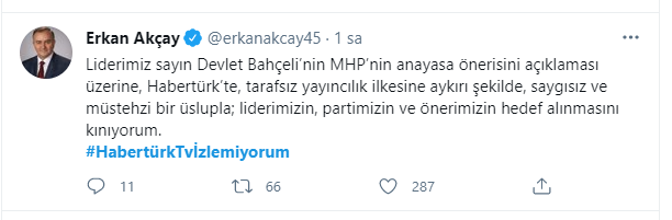 Habertürk canlı yayınında Ebru Baki'nin konuğu olan Hukukçu Pınar Hacıbektaşoğlu, "Hani yazılı olur ya, çocuklar sınavda. Böyle birden biri ilk on dakikada bitirir. Koşar koşa, 'ben bitirdim, ben bitirdim' diye bağırır. Bu çağrıda ona benziyor." ifadelerini kullanarak, MHP Genel Başkanı Devlet Bahçeli'nin dün yaptığı yeni anayasa çağrısıyla, kendince alay etmişti. Hacıbektaşoğlu'nun bu sözleri sarf etmesinden sonra, Ebru Baki başta olmak stüdyodaki herkes kahkaha attı. O anlara tepki ise MHP Genel Başkan Yardımcısı İzzet Ulvi Yönter'den geldi. MHP'li Yönter, "Habertürk’te art niyetli Ebru Baki’ye konuk olan Kemal Öztürk, Pınar Kandemir Hacıbektaşoğlu ile Gülfem Saydam Sanver’in Genel Başkanımızın 100 maddelik anayasa önerisini karalama çabaları edepsizlik ve terbiyesizliktir. Ne o, kaldıramadınız mı? Kudurdunuz değil mi?" dedi.