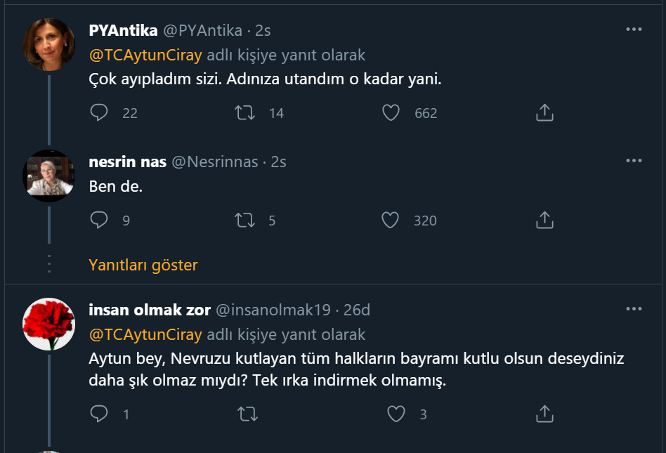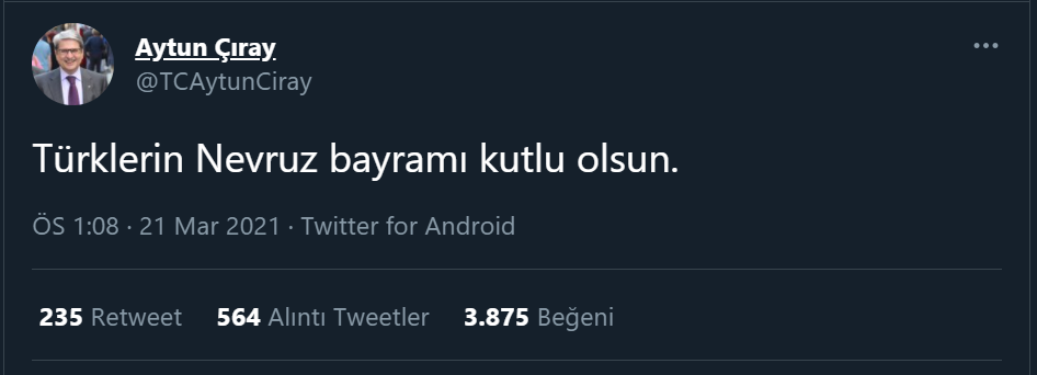 Son olarak, herkesin kutladığı Nevruz Bayramı dolayısıyla bir mesaj yayınlayan İYİ Parti Milletvekili Aytun Çıray, kullandığı ırkçı ifade nedeniyle büyük tepki çekti. Twitter’dan bir mesaj yayınlayan Aytun Çıray, “Türklerin Nevruz Bayramı kutlu olsun” dedi.