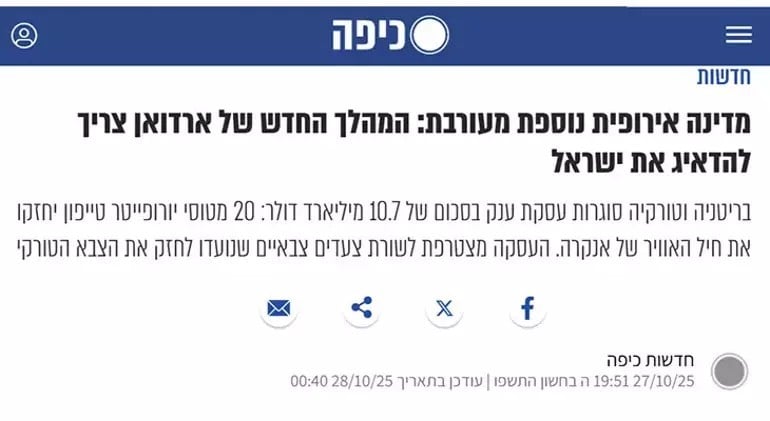 İsrail basınından Mako, gelişmeyi “Dev anlaşma: Türkiye’nin Batı’ya tehlikeli yakınlaşması” başlığıyla duyurdu. Haberde,