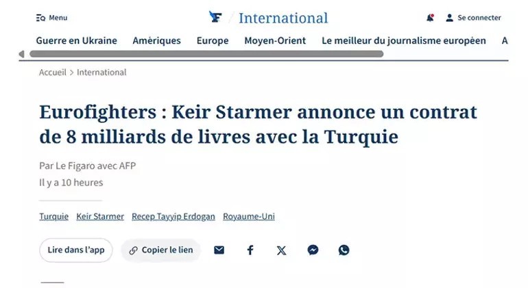 Fransız basınından Le Figaro, “Keir Starmer, Türkiye ile 8 milyar sterlinlik dev Eurofighter anlaşmasını duyurdu” başlığını kullanarak, bu anlaşmanın bölgesel dengeleri değiştireceğini ve Türkiye’nin bölgesel gücünü pekiştireceğini vurguladı.