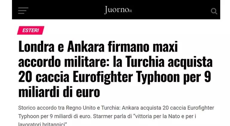 İtalyan basınından Journo, “Londra ve Ankara büyük askeri anlaşmaya imza attı” başlıklı haberinde “Starmer, bu anlaşmayı NATO ve İngiltere için bir zafer olarak nitelendirdi. İki yıl süren müzakerelerin ardından imzalanan bu anlaşma, Atlantik İttifakı’nın iki kilit üyesi Londra ve Ankara arasında yenilenen bir askeri ortaklığı simgeliyor. Ayrıca İngiltere’nin son yirmi yıldaki en büyük savunma uçağı siparişini temsil ediyor" denildi.