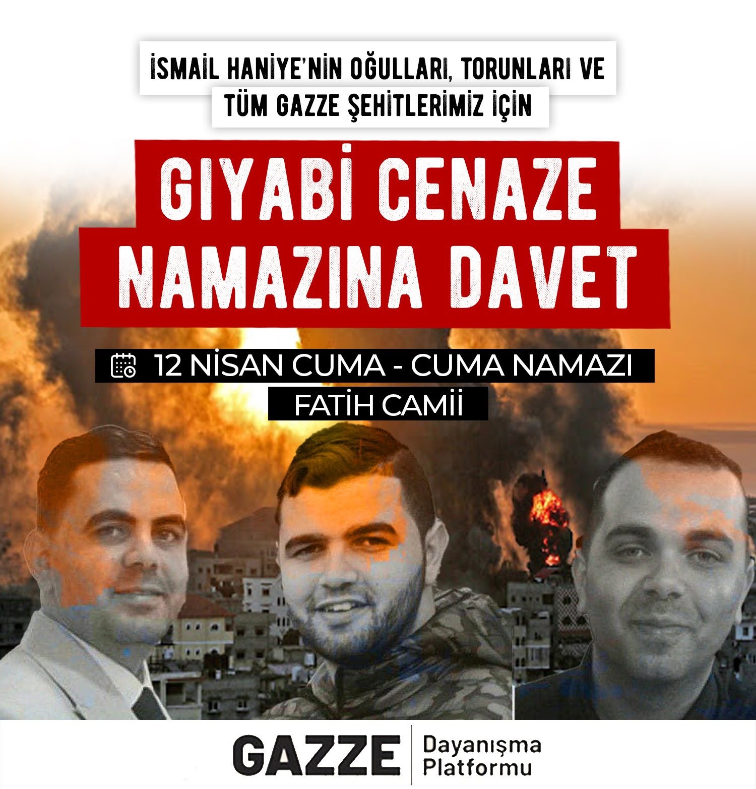 Gazze Dayanışma Platformu, 12 Nisan Cuma günü Fatih Camii'nde Heniyye'nin şehit olan çocukları ve torunları için gıyabi cenaze namazı kılınacağını duyurdu.