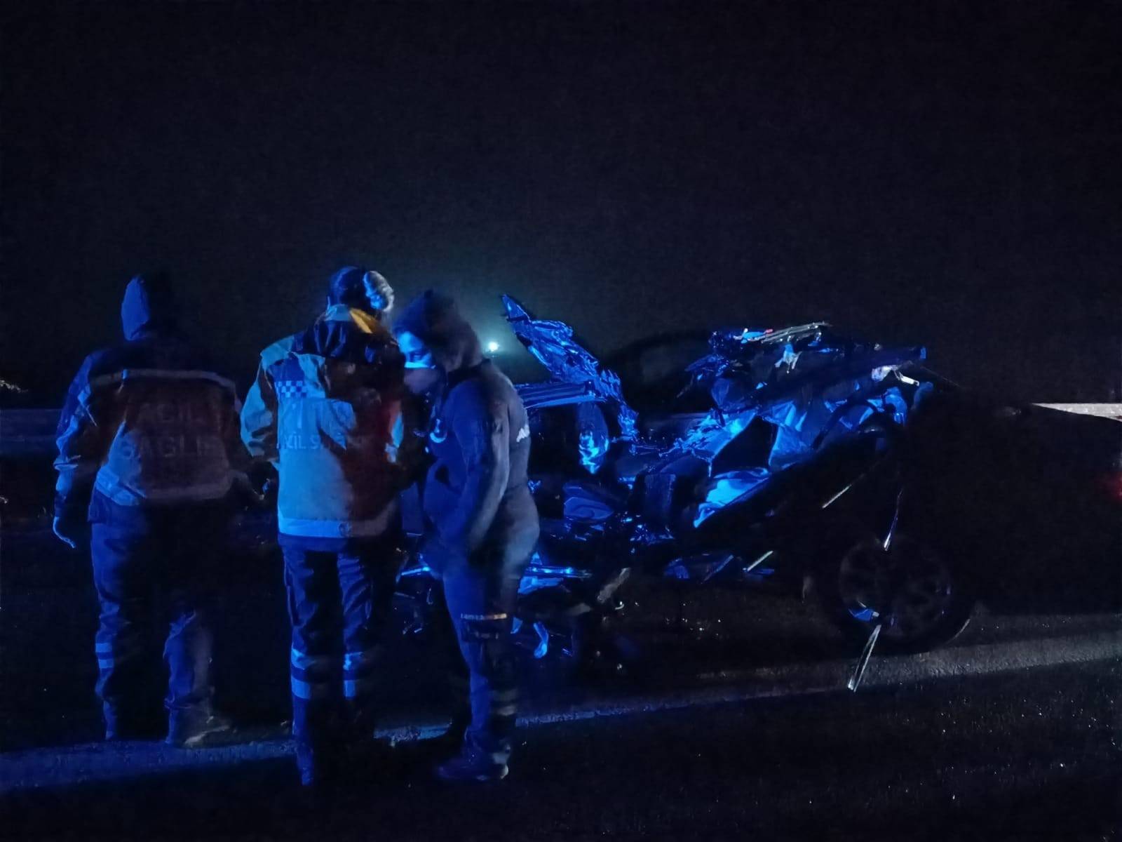 Çarpışmanın şiddetiyle yola savrulan otomobil, korkuluklara çarparak durabildi.