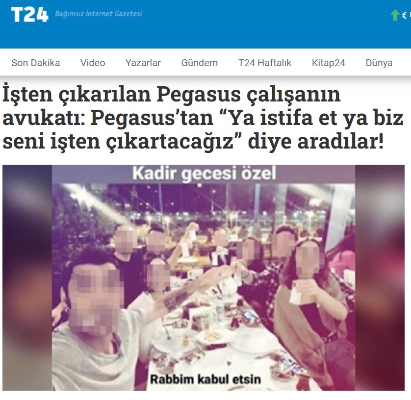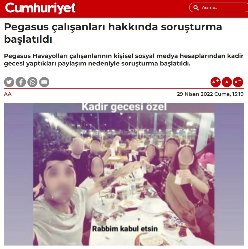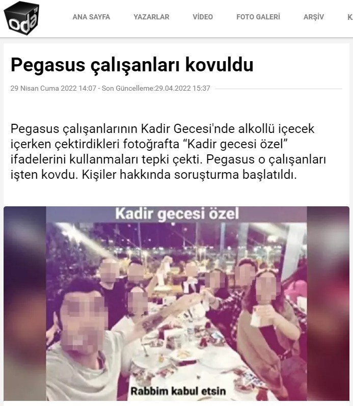 Pegasus çalışanlarından oluşan bir grup insan, sosyal medya hesaplarından içkili bir masa paylaşarak "Kadir gecesi özel. Rabbim kabul etsin" ifadelerini kullanarak bir fotoğraf paylaşılmış ve kamuoyunda infiale neden olmuştu.