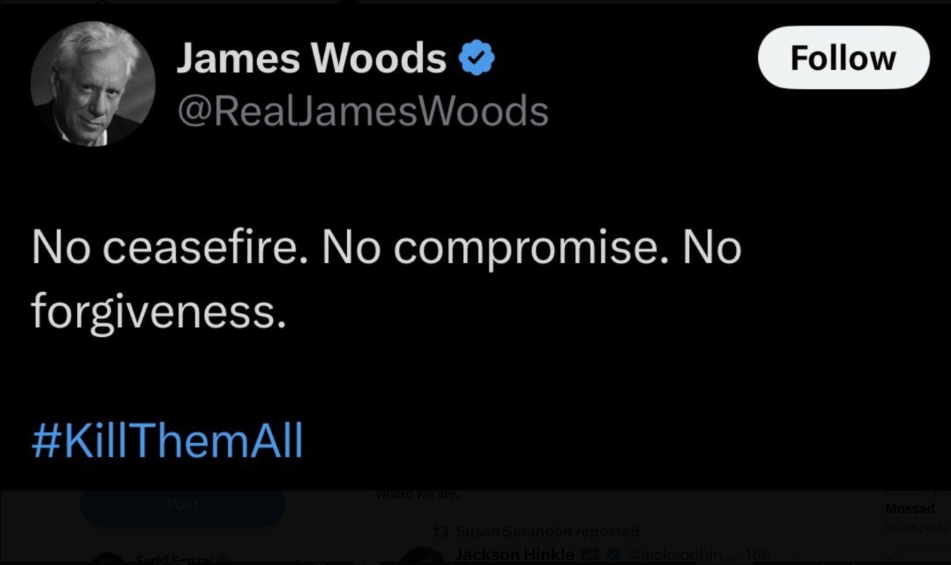 Oyuncu bozuntusu James Woods, sosyal medya hesabından, “KillThemAll” (Hepsini öldürün) etiketini kullanarak Gazze’deki Filistinli mazlumların hepsinin öldürülmesi için terör devleti İsrail’e çağrıda bulunuyordu.