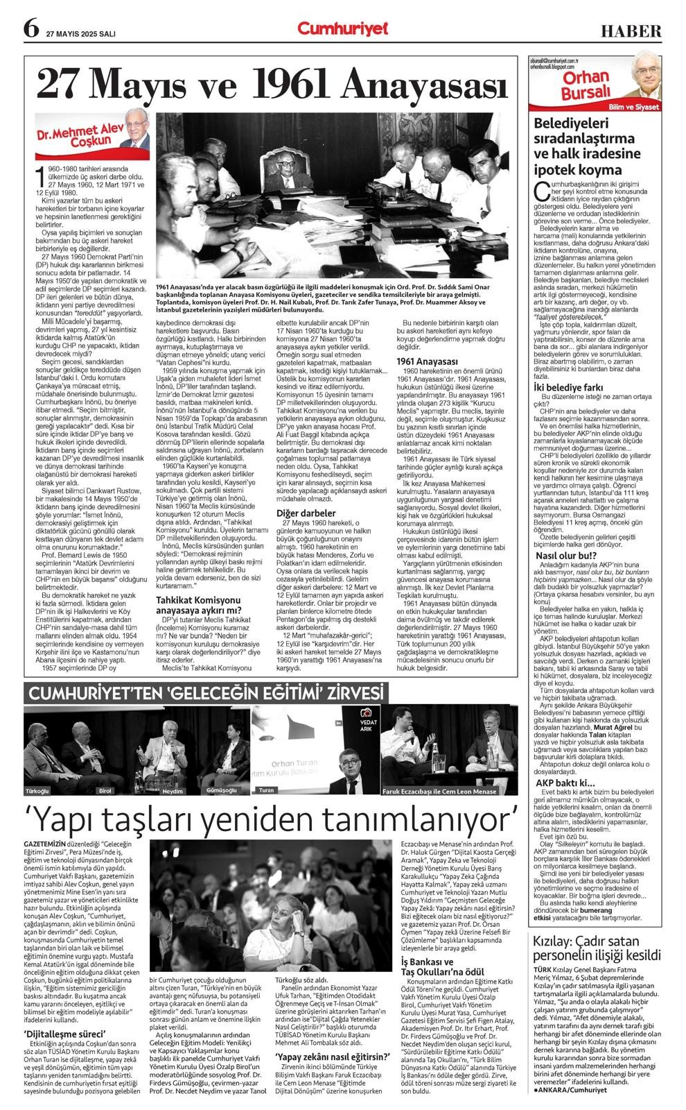 Bugün siyasi tarihimize kara bir leke olarak geçen ve Türkiye’yi yeniden milli ve manevi değerlerine kavuşturmak isteyen Adnan Menderes’in zorla iktidardan indirildiği 27 Mayıs 1960 kanlı darbesinin 65 yılının lanetle anıldığı günde boş durmayan Cumhuriyet, çirkin yüzünü bir kez daha gösterdi.