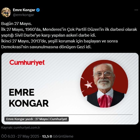 Öte yandan laikçi Emre Kongar da kanlı darbenin yıldönümünde sosyal medyadan yaptığı paylaşımda alçak darbe girişimine aklamaya çalıştı.