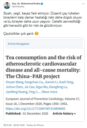 Doçent Doktor Muhammed Keskin, düzenli çay tüketimine ilişkin Çinli profesörlerin kaleme aldığı makaleyi sosyal medya hesabından paylaştı.
