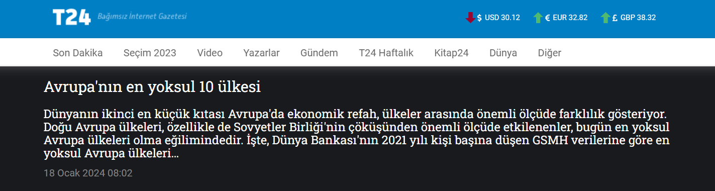 Her fırsatta Türkiye'yi "ekonomik kriz" çığırtkanlığıyla karalayan medya kuruluşlarından T24, "Avrupa'nın en yoksul 10 ülkesi" başlıklı haberinde Türkiye'nin adını bile anamadı.