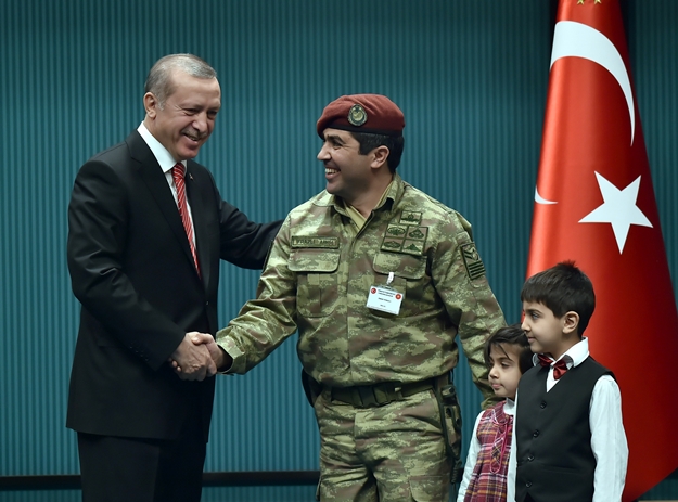 Madalya alan gazi ve şehit yakınlarının aileleriyle hatıra fotoğrafı da çektiren Cumhurbaşkanı Erdoğan, tevcih töreninin ardından madalya sahipleri onuruna resepsiyon verdi.