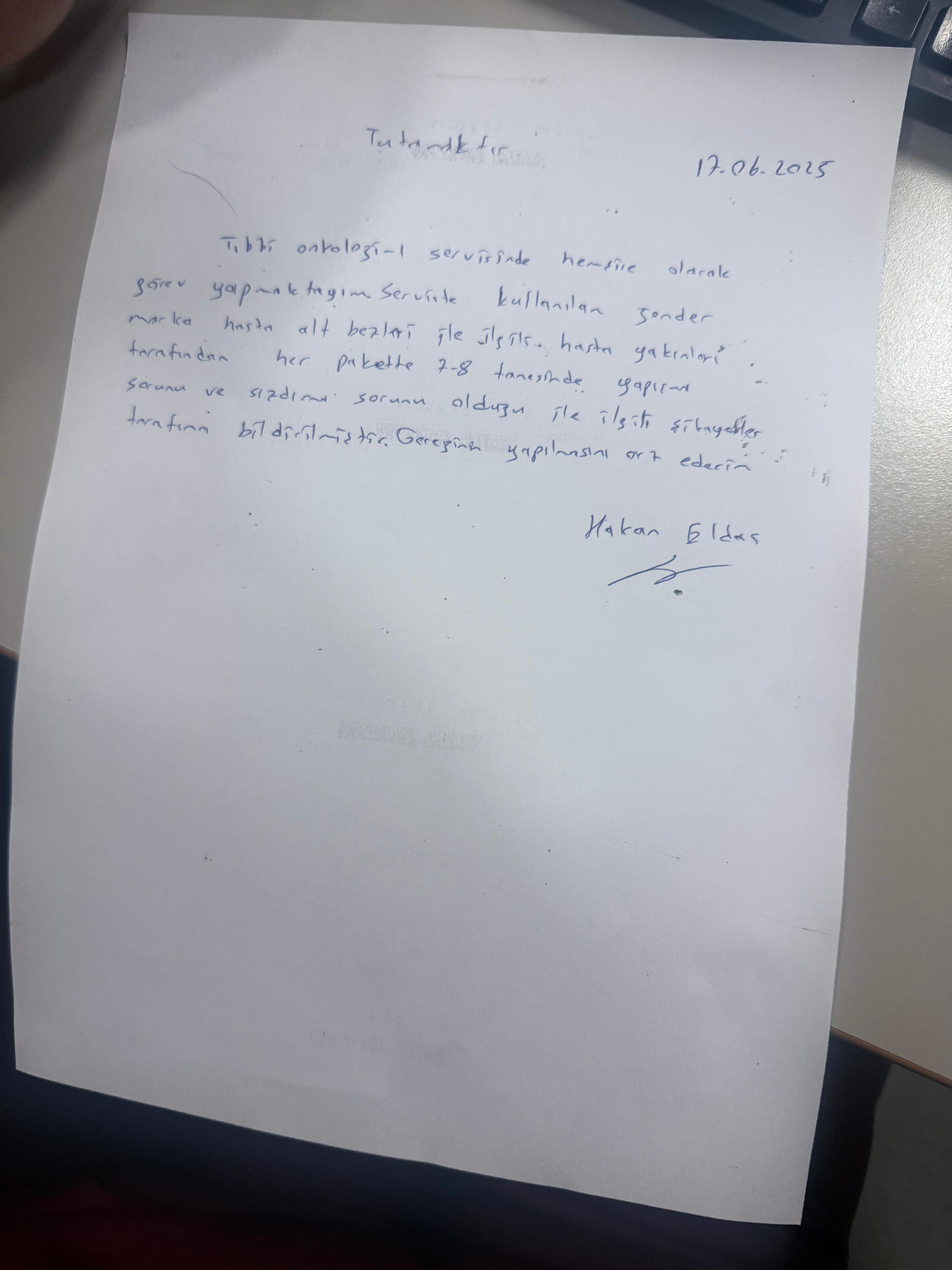 Tutanakta şu ifadeler yer aldı; “Tıbbi Onkoloji-1 servisinde hemşire olarak görev yapmaktayım. Serviste kullanılan Sender marka hasta alt bezleri ile ilgili hasta yakınları tarafından her pakette 7-8 tanesinde yapışma sorunu ve sızdırma sorunu olduğu ile ilgili şikeyetler tarafıma bildirilmiştir. Gereğinin yapılmasını arz ederim”