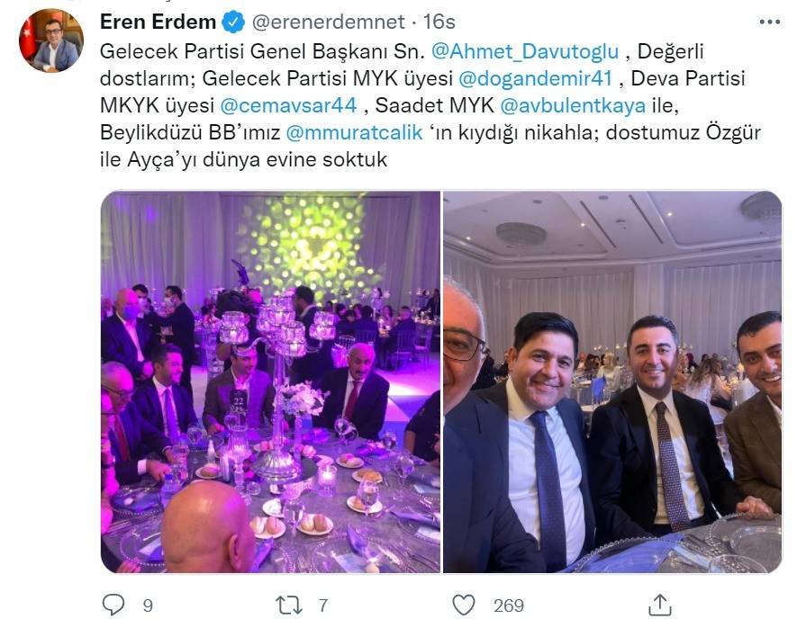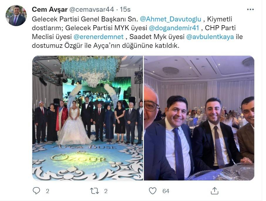 "Gelecek Partisi Genel Başkanı sayın Ahmet Davutoğlu, kıymetli dostlarım Gelecek Partisi MYK Üyesi Doğan Demir, CHP Parti Meclisi Üyesi Eren Erdem, Saadet Partisi MYK ÜYesi Bülent Kaya ile dostumuz Özgür ile Ayça'nın düğününe katıldık."