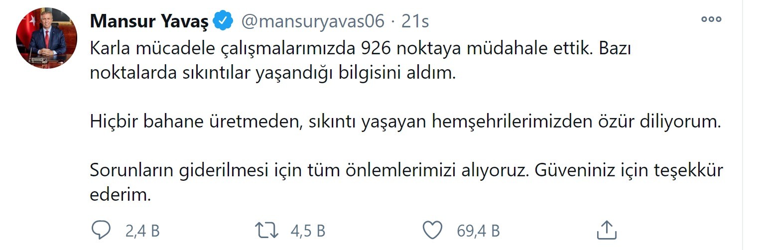ABB Başkanı Yavaş da yaşananların ardından bir özür açıklaması yayınladı. Yavaş, “Karla mücadele çalışmalarımızda 926 noktaya müdahale ettik. Bazı noktalarda sıkıntılar yaşandığı bilgisini aldım. Hiçbir bahane üretmeden, sıkıntı yaşayan hemşehrilerimizden özür diliyorum. Sorunların giderilmesi için tüm önlemlerimizi alıyoruz. Güveniniz için teşekkür ederim” dedi.