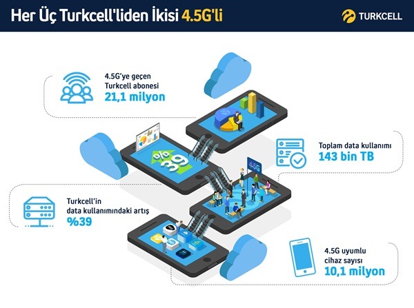 Türkiye’de 1 Nisan 2016 tarihinde kullanılmaya başlanan 4.5G teknolojisine geçiş yapan Turkcell’lilerin sayısı 21 milyonu aştı. Dünyanın en hızlı 4.5G altyapılarından birisini Türkiye’de hayata geçiren Turkcell’in dijital servislerinin kullanımı da 4.5G ile birlikte hızla artarken, 4.5G’ye geçiş yapan abonelerin data kullanımları da yaklaşık 2 kat artış gösteriyor.