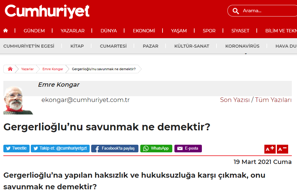 Cumhuriyet yazarlarından Ali Sirmen Danıştay'ın andımız kararı üzerinden Atatürkçülük şovu yaparken, aynı gün bir diğer yazarı Emre Konger de eski HDP Milletvekili Ömer Faruk Gergerlioğlu'nun 'hak'kını savundu.
