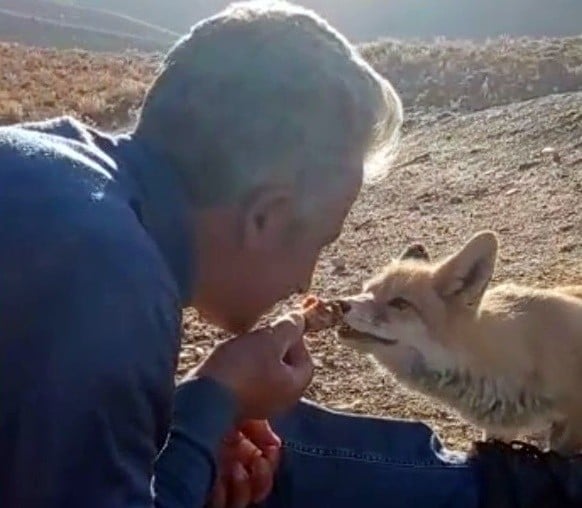 Hakkari’nin Yüksekova ilçesinde yaşayan Mehmet Duru isimli vatandaş, aç kalan tilkiyi elleriyle besleyerek su verdi.