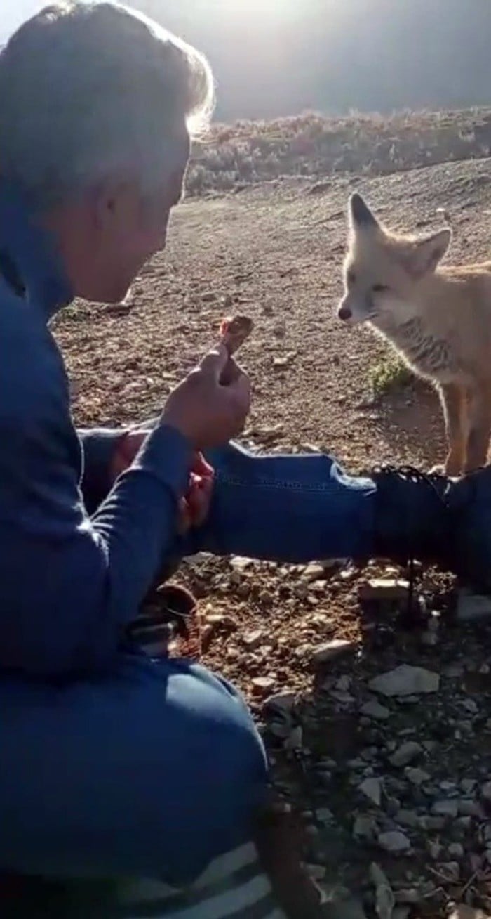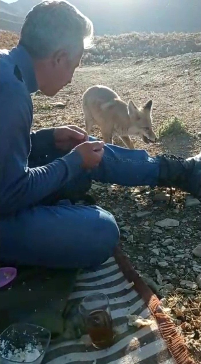 Elleriyle tilkiyi beslediğini belirten Mehmet Duru, “Sabah piknik için beldeden Meydan Belek Yaylası’na geldik. Piknik yaptığımız sırada aç kalan bir tilki etrafımızda dolaşıyordu. İlk önce yanımıza gelmekten korkuyordu. Pişirdiğimiz etleri elime alarak yanına yaklaştım. Tilki kaçmayarak yemeye başladı. Karnını doyurduğumuz ve su verdiğimiz tilki yanımızdan hiç ayrılmadı. Lütfen çevremizdeki hiçbir hayvanı aç bırakmayalım” dedi.