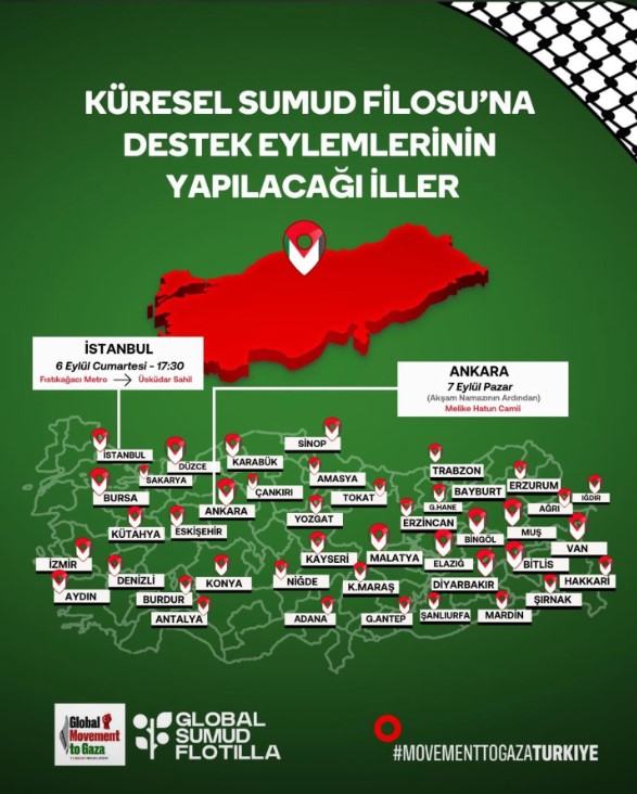 Gazze ablukasını kırmak için yola çıkan Küresel Sumud Filosu’na destek amacıyla Türkiye’nin 30’dan fazla ilinde eş zamanlı eylemler düzenlenecek; İstanbul'daki eylem bugün 17:30'da Üsküdar'da başlayacak.