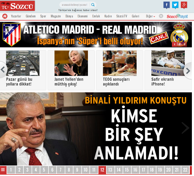Sözcü Gazetesi internet sitesinde Binali Yıldırım’ın açıklamarını ‘Binali Yıldırım konuştu, kimse bir şey anlamadı’ manşetiyle aktardı. Yıldırım’ın açıklamarında umduğunu bulamayan ve hayalleri suya düşen Sözcü, ne yapacağını şaşırınca kendine ilke edindiği olayı çarpıtma yoluna gitti.