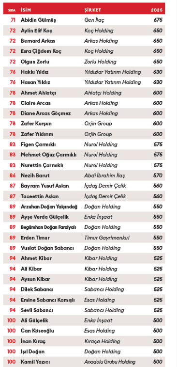 2025’teki listede 108 kişi yer alıyor. Toplam servetleri 128,5 milyar dolar.