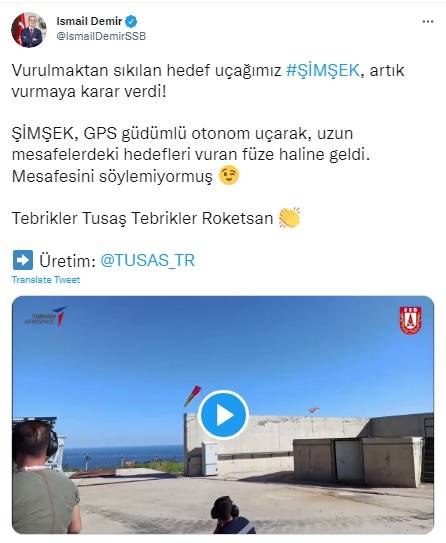 Yeni Şimşek için sosyal medyadan açıklama yapan Savunma Sanayii Başkanı İsmail Demir, "Vurulmaktan sıkılan hedef uçağımız ŞİMŞEK, artık vurmaya karar verdi! ŞİMŞEK, GPS güdümlü otonom uçarak, uzun mesafelerdeki hedefleri vuran füze haline geldi. Mesafesini söylemiyormuş. Tebrikler Tusaş Tebrikler Roketsan" ifadelerini kullandı.