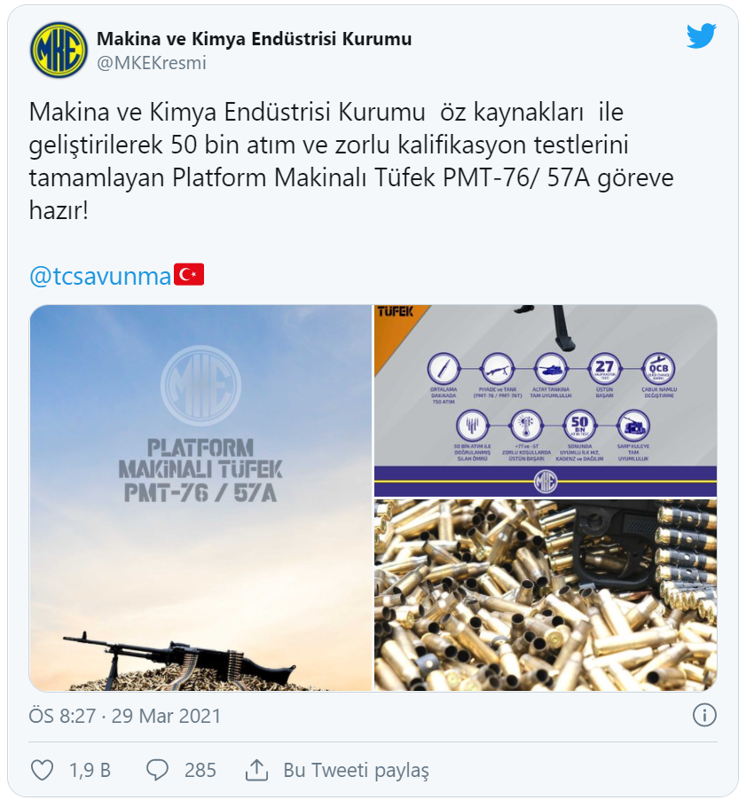 MKEK resmi Twitter hesabından yapılan açıklamada, “Makina ve Kimya Endüstrisi Kurumu öz kaynakları ile geliştirilerek 50 bin atım ve zorlu kalifikasyon testlerini tamamlayan Platform Makinalı Tüfek PMT-76/ 57A göreve hazır!” ifadelerine yer verildi.
