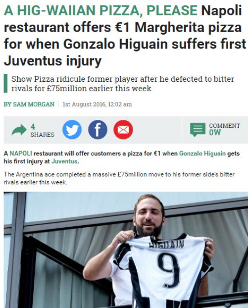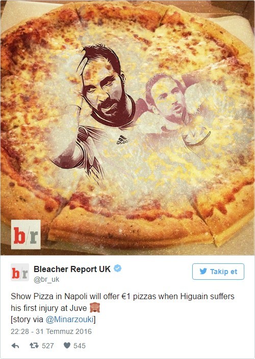 Juventus'a imza atan Higuain'e duyulan öfke başka bir boyut kazandı. Napoli'de bulunan bir pizza restoranı, Arjantinli golcünün ilk sakatlığını yaşaması durumunda pizzaları 1 eurodan satacağını duyurdu.