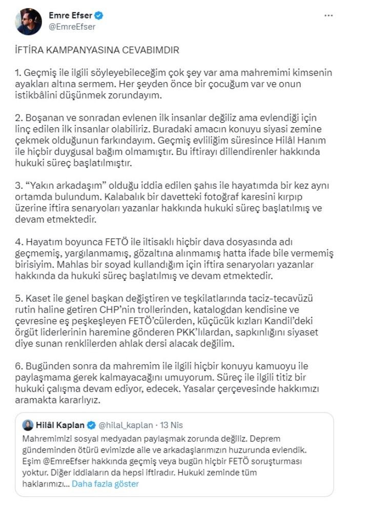 Eşi Hilal Kaplan'ın, "Mahremimizi sosyal medyadan paylaşmak zorunda değiliz. Deprem gündeminden ötürü evimizde aile ve arkadaşlarımızın huzurunda evlendik. Eşim Emre Efser hakkında geçmiş veya bugün hiçbir FETÖ soruşturması yoktur. Diğer iddiaların da hepsi iftiradır. Hukuki zeminde tüm haklarımızı arayacağız. Kamuoyuna saygıyla duyurulur." paylaşımını alıntılayan Sarı, Twitter hesabından uzun açıklama yaptı.