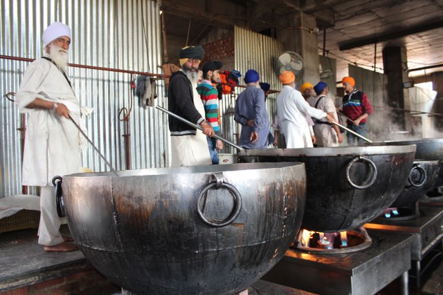 Altın Tapınak’taki şahsım adına belki de en renkli yer Guru Ka Langar idi. Burası günlük 60.000 ile 80.000 hacının yemek yediği bir yer. Girenler ve çıkanlar hiç ama hiç eksik olmuyor. Mâbedin toplam ziyaretçi sayısı zaten 100.000. Buraya gelen hacılar veya turistler yemek yiyorlar ve herhangi bir ücret ödemiyorlar. Gönüllülük esasına dayalı herkes bir şekilde işin ucundan tutuyor. Ben boynumda fotoğraf makinem her yere girip çıktım. Kadınıyla, erkeğiyle, çocuğuyla bir yanda dağ gibi soğanları kesenler, bir yanda devâsa kazanlarda yemek karıştıranlar, yemek yapanlar, bulaşık yıkayanlar... Muhteşem bir işbirliği ile herkes çalışıyordu. Ben de oradan oraya geçerek fotoğraf çekiyordum. Bir yere gelip, artık daha fazla gitmemem gerektiğini düşündüğüm bir sırada, yaşlı bir Sih gelerek kulağıma eğildi ve “Çekinme, hepimiz eşitiz, kimsenin kimseye üstünlüğü yok” şeklinde bazı ifadelerle beni teşvik etti. Bir şey yemek için de ısrar ettiler ama tok olduğumu söyleyerek kibarca geri çevirdim.
